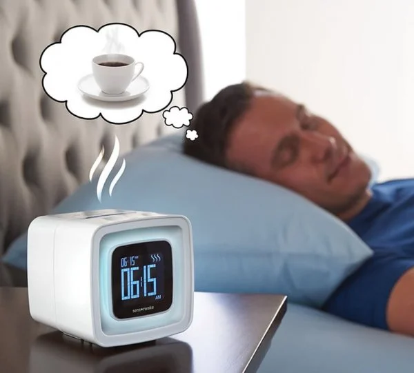This alarm clock works differently. He will wake you up... with the smell. Coffee, mint, orange, freshly cut grass, sea coast, pine forest or apple with cinnamon? Only you can decide which of the proposed scents will wake you up in the morning.