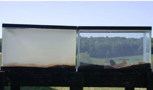 Mussels have the ability to purify water. One aquarium does not have them, but the other does.