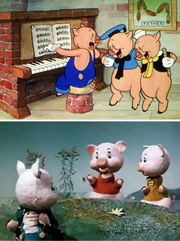 Disney's The Three Little Pigs appeared in 1933. By the way, pay attention to the Easter egg: a picture on the wall with the caption “Father”. The Soviet puppet cartoon was released in 1974.