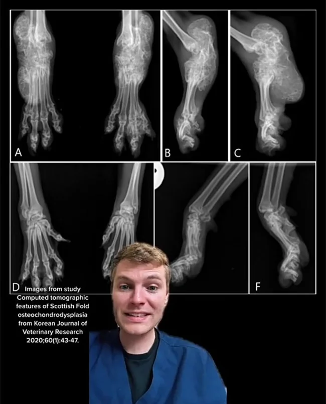 Hanging ears are the main feature of these cats. But they appeared as a result of osteochondrodysplasia - a disorder of the development of cartilage tissue. They also have this problem with joints throughout the body. This is why even young cats of this breed are often diagnosed with arthritis. Several x-rays showing deformed joints of Scottish Fold cats: