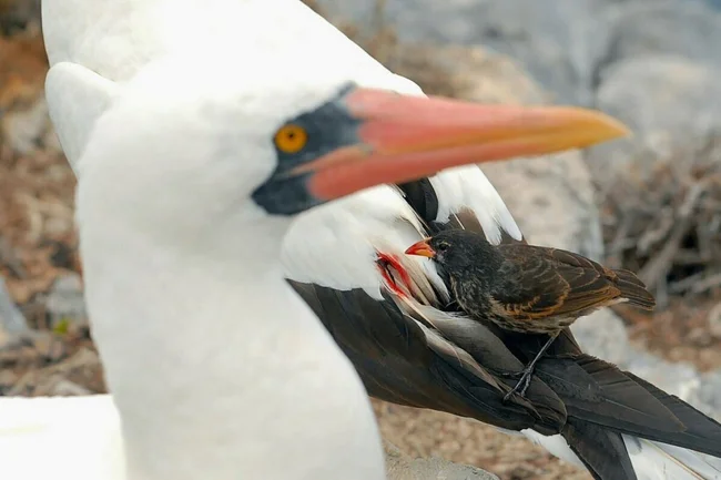 The main victims of the bloodsucker are Nazcan and blue-footed boobies. Moreover, these birds are much larger than the finch, but they allow him to sit on his back, do not resist at all and do not drive away the little vampire. There's a reason for this: finches usually rid gannets of parasites and annoying insects by pecking them out of their feathers and skin. Here is an unusual mutually beneficial coexistence: finches rid gannets of parasites, and they give them blood to drink.
