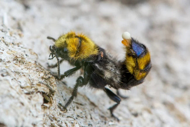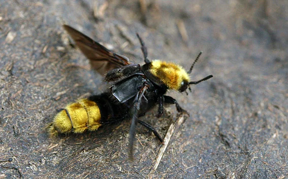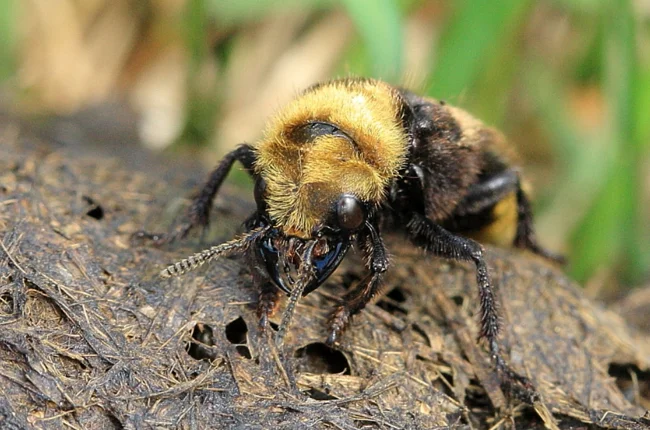 It doesn't take a genius to notice the furry predator's resemblance to bees and bumblebees. Our hero copies striped workers for a reason: this way he neutralizes possible attacks from larger predators. Birds and other insects are not strong in entomology, so they are in no hurry to approach black and yellow objects. But here’s a life hack for you by definition: if a fluffy bumblebee is sitting on a fragrant flower, then a hairy rove bee is hiding on a fragrant heap of dung.