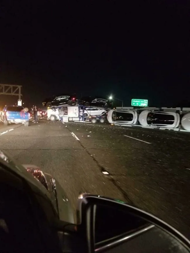 19. A Tesla truck overturned on someone's street