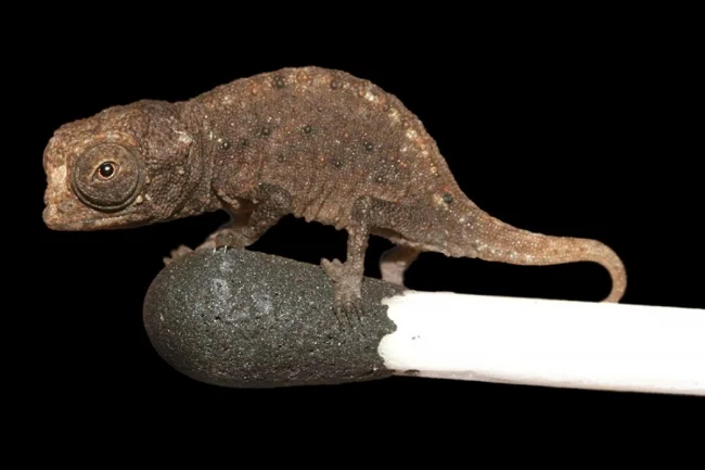 A tiny reptile, up to 29 mm in size. It lives on one of the islands near Madagascar and is an example of dwarfism in the species.