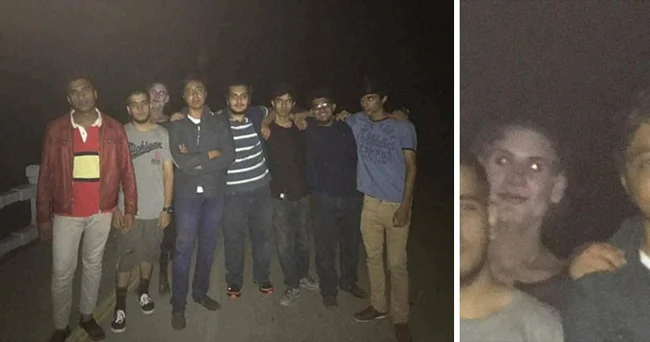 “4 days ago, my friends and I went to Murree [Pakistan]. We were walking in the Murree hills at 2 or 3 am when this happened. We were all together. One friend suggested we take a group photo and did it with flash because the lighting was almost non-existent. When I looked at the photos later, I was shocked to see a man standing right behind one of my friends. He had a pale white face, and if you look closely at his legs, you can see that they do not look human. None of us knew this man standing third from the left.”