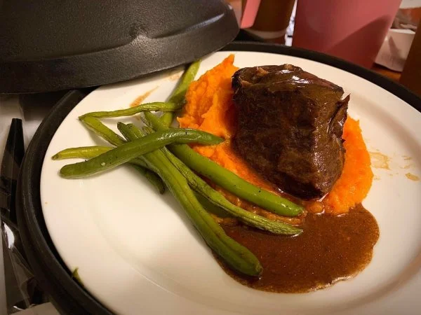 Braised short ribs with sweet potato puree. Long Island, New York. Tender meat and appetizing appearance. Minimum 8.5 for a hospital dinner.