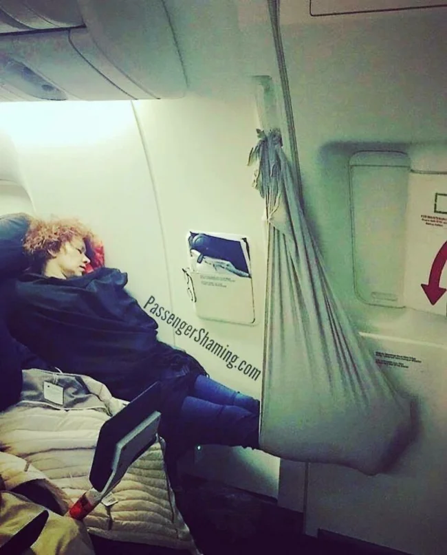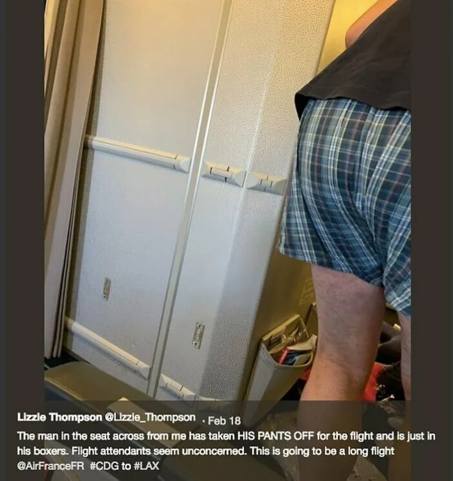 26. “The man across from me took off his pants on the plane and was left in just his underpants. The flight attendants don’t seem to care. It’s going to be a very long flight.”