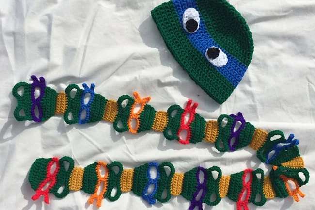 Scarves in the form of frogs and pandas are generally commonplace, but the version with the faces of ninja turtles turned out to be really funny.