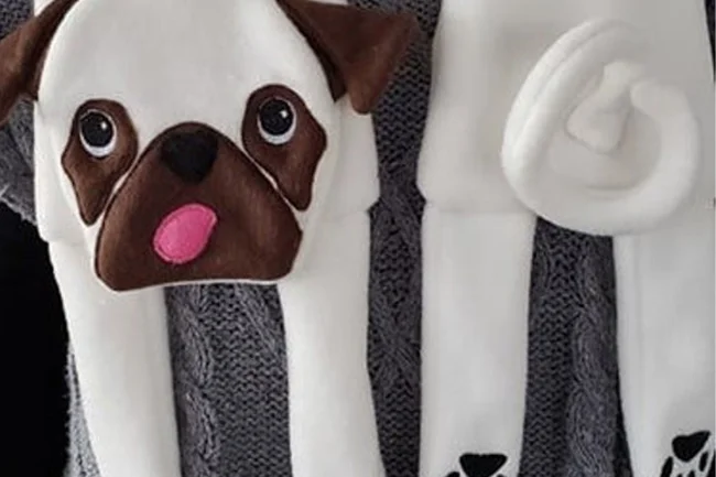 A selection of scarves from a raccoon, a sloth and a pug: what else could be cuter? They will please the eye and warm you in the cold winter.