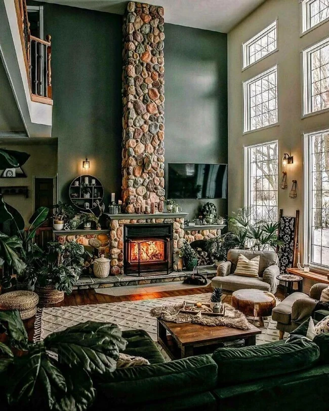 23. Two-level living room in green with a fireplace and many plants, Winnipeg, Canada