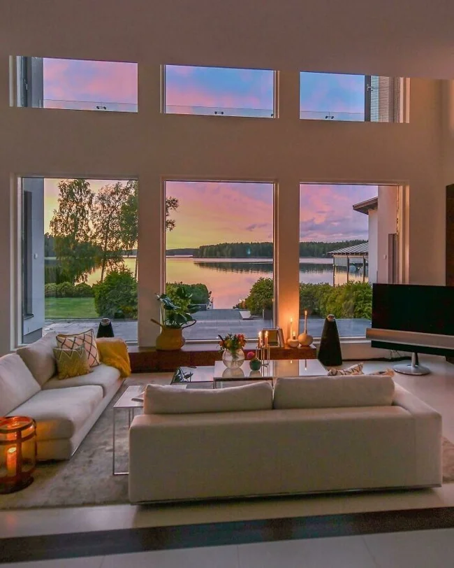 12. Magnificent living room of a house in Finland on the shore of a lake