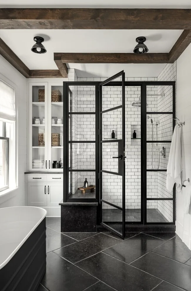18. White tile shower with black framed doors in a modern farmhouse, Hudson Valley, New York