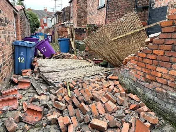 2. "It's a little windy here in the UK at the moment. I walked into the alley behind my house and saw this picture. Poor neighbors!"