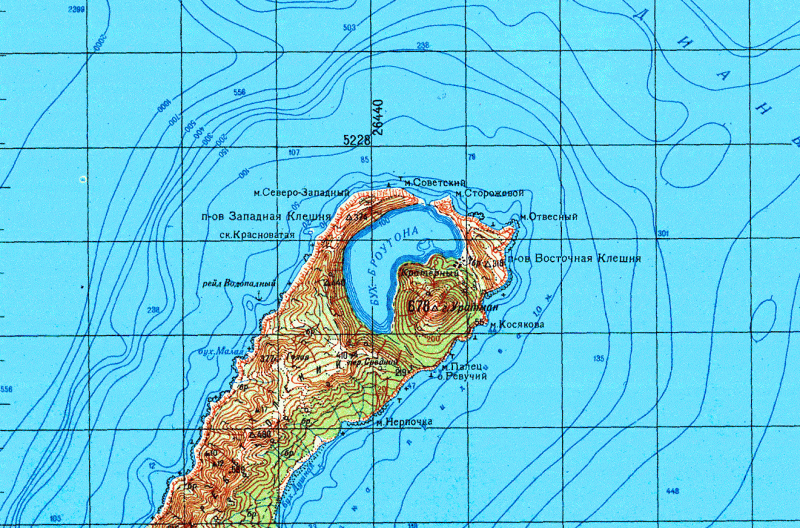Cape Sovetsky is the entrance cape to Broughton Bay. Parts of the bulk carrier "POSIET". The ship was standing near the entrance to the bay. During a strong storm, she was torn from her anchors and thrown aground near the cape. (this happened in 1979).