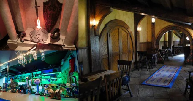 The cafe itself is decorated in the style of a game: a Gothic hall, a fire pit, and huge glasses.