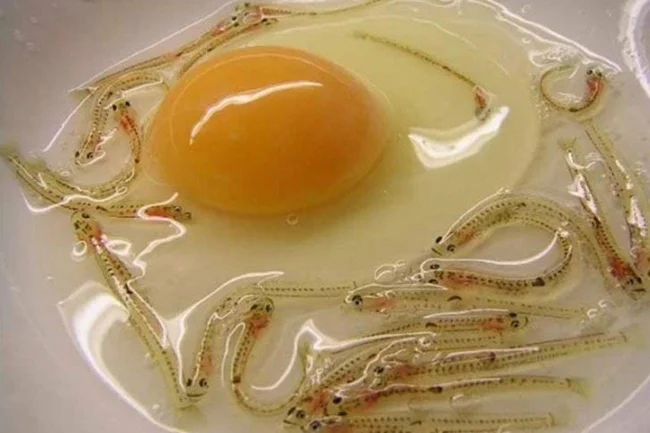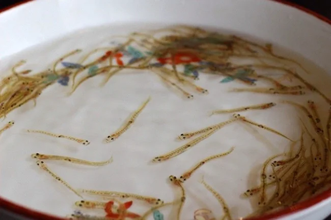 The dish consists of live Shiro fish, which is filled with egg white and quail egg yolk, and vinegar.