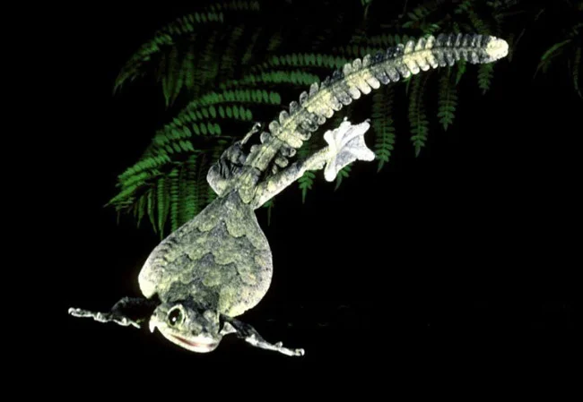 Well, almost: thanks to the aerodynamic properties of their skin outgrowths and huge flat tail, lizards can float in the air like paper airplanes. This super ability allows them to make jumps up to 70 meters long, flying from one tree to another!