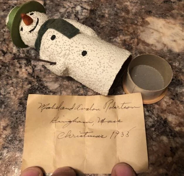 8. “I found this little snowman in a box of old Christmas tree decorations. Turns out it was a candy gift from 1933.”