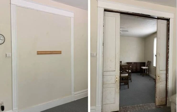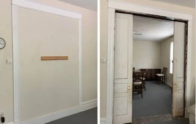 “These sliding doors were hidden behind drywall. They separate the living room and dining room."