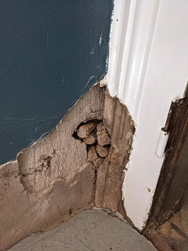 “Funny finds in my 1870s stone house. We always thought that the big bulge in the corner of the room was a jagged piece of stone. They tried to remove it - and it turned out that it was a hole clogged with corn cobs." ![]()