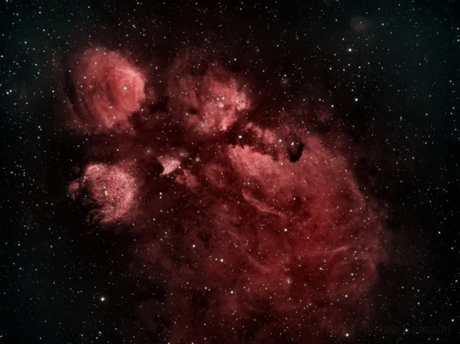 This lovely nebula, NGC 6334, is located in the constellation Scorpio. In fact, this is a complex containing regions of formation of massive stars at different stages of stellar evolution.