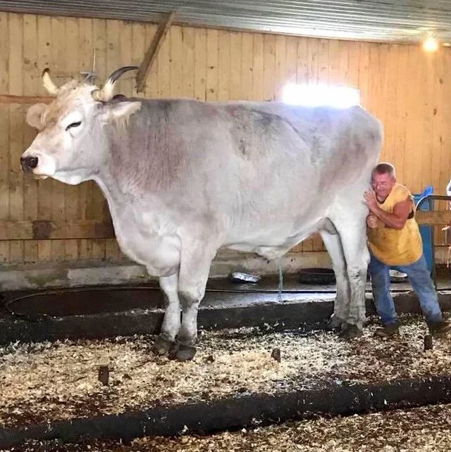 Giant bull Tommy, weighing 1360 kg, and his owner