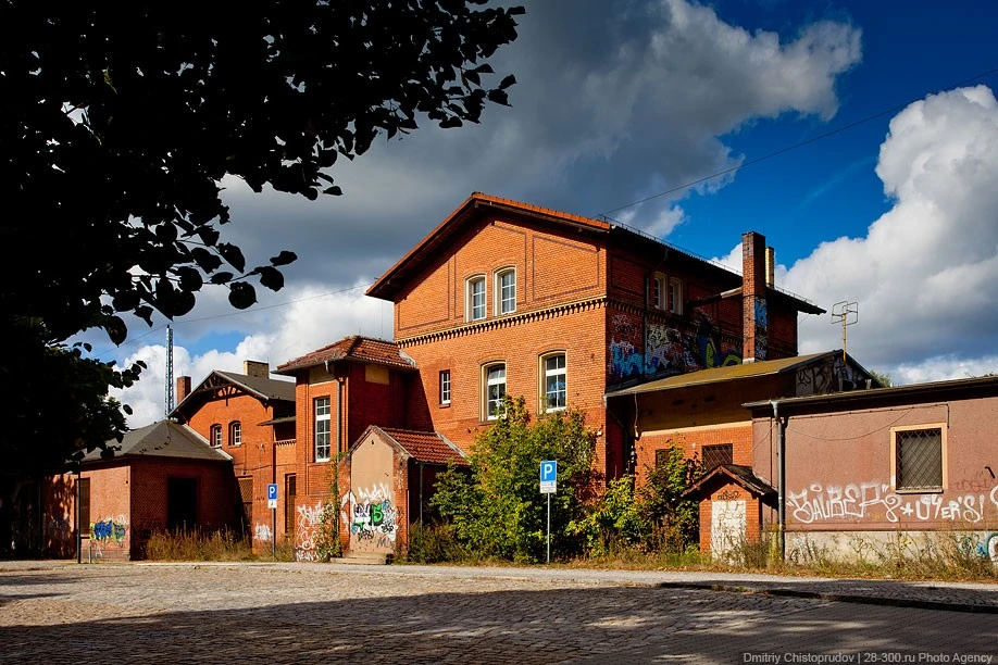 A complex of buildings south of the railway. In the center of the square near this canteen and gym building, in the 70s, a monument to the Soviet military orderly was erected. The same monument in the title photo.
