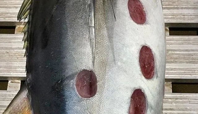 Fishermen caught tuna with large bite marks all over its body. Some people were quick to say it couldn't have come from another fish or shark as the bites were too round. However, scientists have found that these holes were made by a cutter shark. This specific predator bites off large chunks of its prey without killing it.