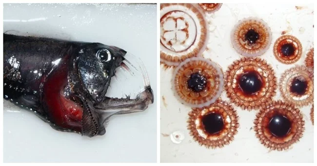 Trapman Bermagui discovered this deep-sea Sloan snakefish. This species is easily recognized by its long, fang-like teeth. It was originally a dark silver-blue color, with the sides covered in hexagonal pigmented areas. During the day it lives at depths of 500 to 2,500 meters, but at night it moves to shallower waters, less than 600 meters. Snakefish can be found mainly in Australia, feeding on small fish.