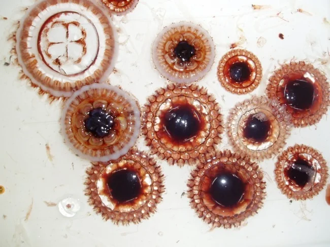 This jellyfish is considered the queen of its entire family. This is because her form looks like she has a small crown on her head. It is also easily recognized due to its red color, which is not visible in deep waters. In fact, it appears completely dark at depths of over 1,000 meters, giving it the ability to hide from predators.