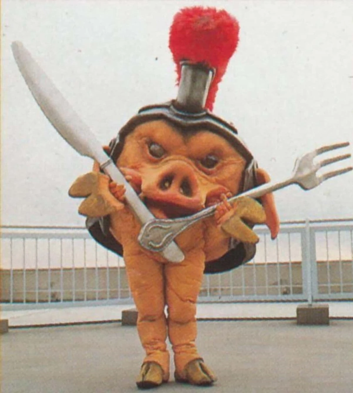 The monster's arsenal included green lightning bolts that he shot from his eyes, as well as a fork and a knife, which he used as weapons.