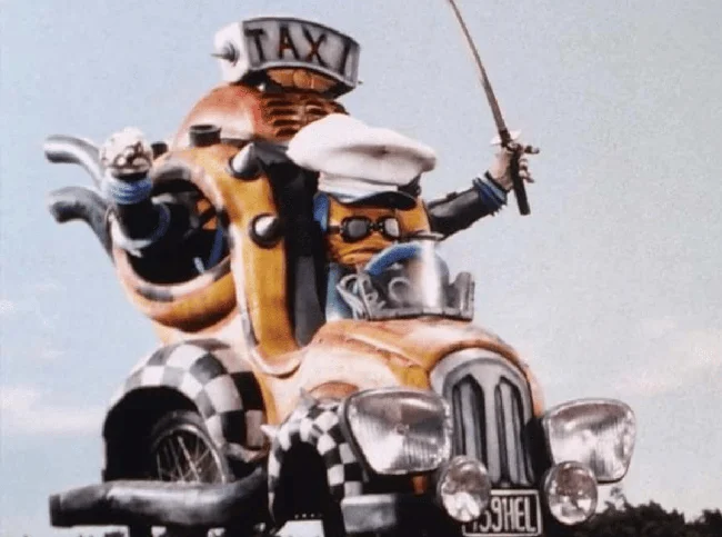 Essentially, this strange creature is a hybrid of a taxi and a crab. It rides on wheels and chases people with a sword.