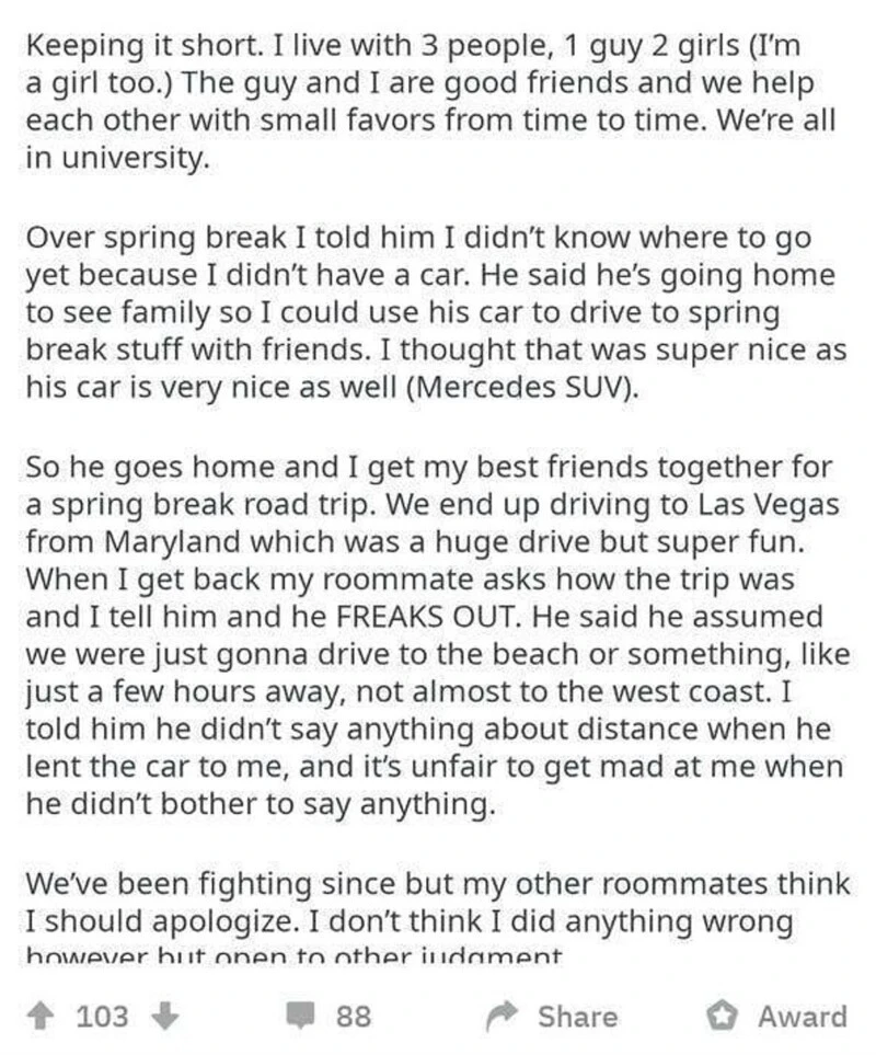 So he's going home and I'm going on a trip with my friends. We ended up going to Las Vegas from Maryland, it was a long but fun journey. When I returned, the neighbor asked how the trip was and got mad. He thought we'd go to the beach or something nearby, a few hours' drive at most, but not to the west coast. I said he didn't say anything about distance when he borrowed the car. He shouldn't be angry with me if he didn't bother to warn me.