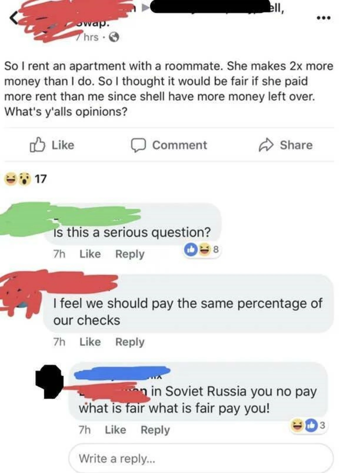 I live with three neighbors (one guy and two girls, I'm also a girl). This guy and I are friends and sometimes help each other. We study at the same university.
