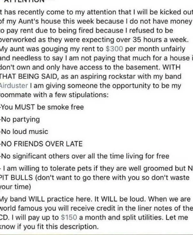 I found out that this week my aunt is going to kick me out of her house because I don't have money to pay rent. I refused to work more than 35 hours a week and was fired. My aunt jacked up the rent to $300, and I'm not willing to pay that kind of money for a house that I don't own and only have access to the basement. With all that said, I, as the rising star of the rock band Airduster, give you the opportunity to become my roommate, but there are conditions: