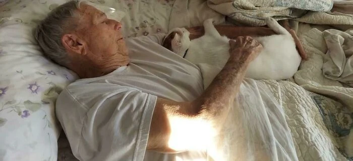 11. “Mom adopted a shelter cat for her elderly parents. She was afraid that grandfather would be against it... Here is the cat and grandfather after a while.”