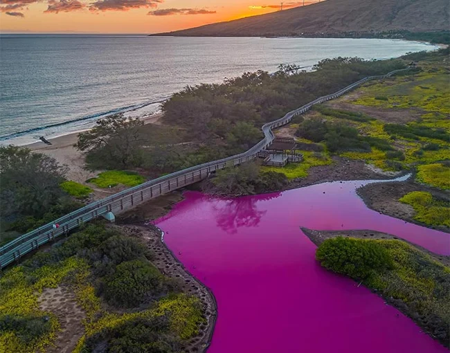 This amazing lake is located in Hawaii. Its waters are colored bubblegum due to the influence of halobacteria (single-celled organisms), which become active during times of severe drought and increased salinity.