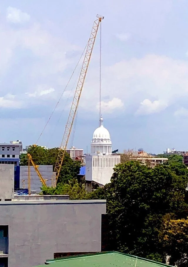 The crane holds up this building