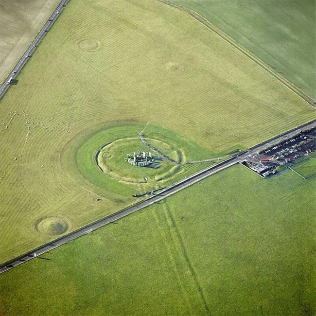 But from above the view is completely different: there are modern roads nearby, sheep grazing and a large parking lot. Surrounded by this modern surroundings, Stonehenge seems like an ordinary dump of stones.