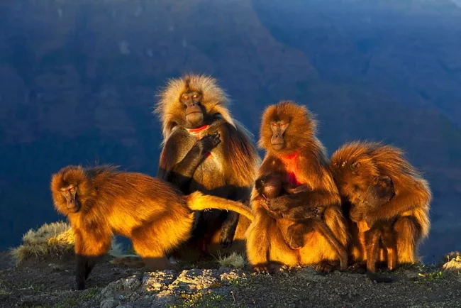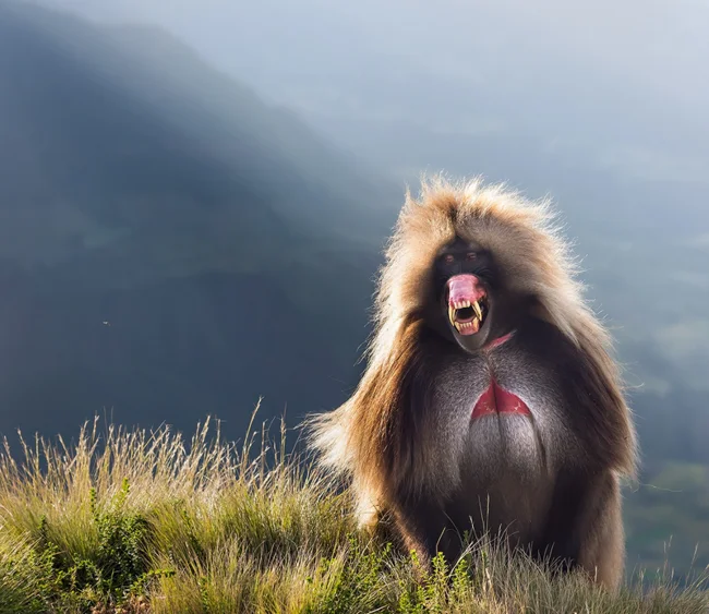 High, high in the mountains of hot Ethiopia there is a place called the Simen Mountains. There, on the plateau of these mountains, near the scorching Sun, there live creatures with a bleeding heart and a lion's mane. Their voice is similar to a human one, but woe to anyone who decides to approach them without fear because of this. Meet the gelada, one of Africa's most epic monkeys!