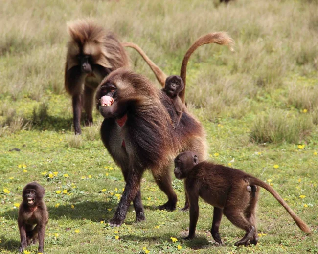 Their closest relatives are baboons. Geladas were identified as a separate species due to a whole bunch of unique features. The most obvious feature is the “bleeding heart”. In fact, it is not a heart at all, but a bald area of the chest. In its normal state it is pale pink. But alpha males and females who are ready for romance have skin that turns red and scalded!