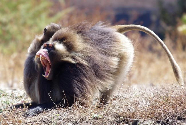 And there is something to defend against. Geladas are very large monkeys, the weight of males reaches 15-20 kg. But you can’t crush a competitor with dimensions alone. The males' fangs are as long and thick as the index finger. Not every predator has these!