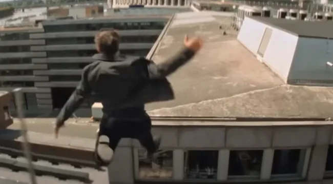 The trick required Sylvester to drop his skis in the air, and only then open the parachute, but no one took into account that during the fall, the dropped skis would remain on top, and when the parachute opened, there was a chance that the skis would damage it or simply pierce it. This is practically what happened - after the parachute opened, the skis touched its upper part, but fortunately, the parachute withstood such contact, and the stuntman reached the ground unharmed.