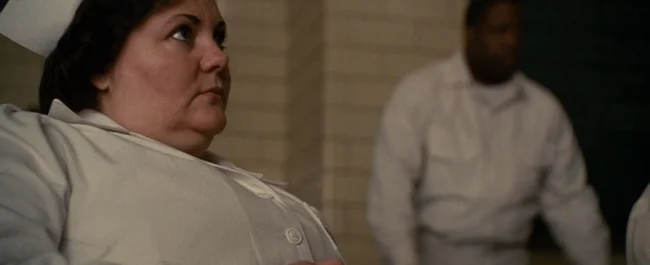 Сцена із санітарами особливо цікава, якщо вдивлятися у всі обличчя. Співробітники перебувають у певній напрузі через присутність Тедді, який запросто може комусь із них нашкодити, проте між ними у них прослизають смішки, тому що вони не сприймають Тедді всерйоз і не вірять, що його можна буде вилікувати. На першому кадрі медсестри та санітари посміхаються і видають нечутні смішки, коли їхній колега Лестер Шин зображує маршала. А в другому кадрі вони всі починають нервувати, коли Тедді відчуває брехню, підводиться і йде до одного санітара. Медсестра різко перестає дихати, санітари навколо змінюють свої стійки на бойові і готуються відбивати колегу, якщо у Тедді почнеться напад. Ну а третій кадр найяскравіший для глядача. Лестер Шин переглядається з одним із санітарів, усміхається і киває йому, а той усміхається у відповідь, а потім вони розходяться у різні боки. Дуже дивні стосунки між двома людьми, які вбачають один одного вперше. А на четвертому та п'ятому кадрах особистість Лестера Шина знову ставиться під загрозу. Коли одна з медсестер говорить про лікаря, який лікує пацієнтка, вона згадує доктора Лестера Шина, який у цій виставі грає напарника Тедді. У цей момент медсестра починає гаяти, ніби не мала цього говорити. Вона кілька разів коситься на Лестера, а потім кадр перекладається на Чака Оула, який теж трохи злякався через те, що Тедді може помітити недобре.