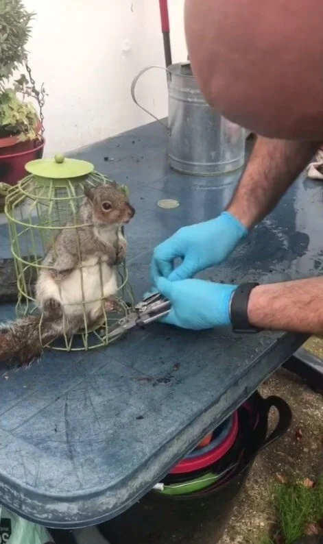 Білка об'їлася горіхів і застрягла у пташиній годівниці.
