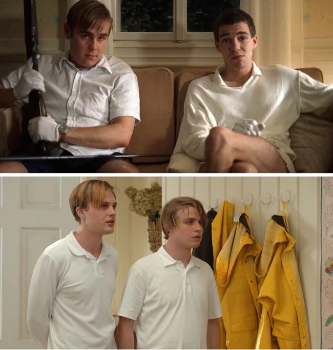 Заміна Арно Фріша та Франка Гірінга на Майкла Пітта та Бреді Корбета в авторемейці 2007 року трилера Міхаеля Ханеке «Кумедні ігри». Режисер перезняв свій фільм на німецькій мові, що вийшов у 1997 році.