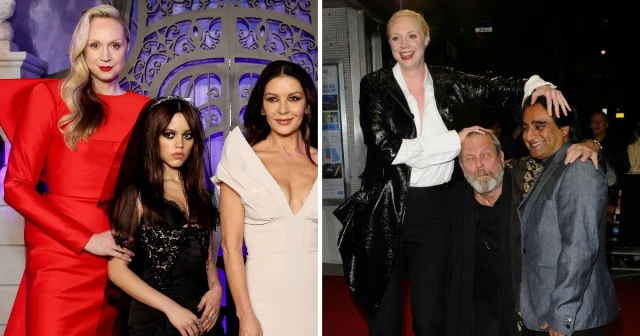Видно, що і на тлі чоловіків і на тлі Дженни Ортегі (155 см) актриса виглядає дуже високою.