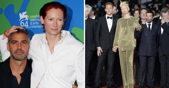 Акторка не соромиться ще більше подовжувати свій образ за рахунок нарядів та зачіски. На фотографії 2007 року Джордж Клуні жартома сів поруч зі своєю високою колегою.