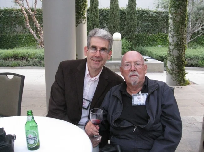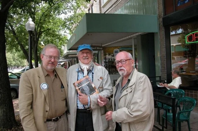 Гаррі Гаррісон (праворуч) разом зі старим другом Браяном Олдіссом (у центрі) та фантастом Грегом Біром.