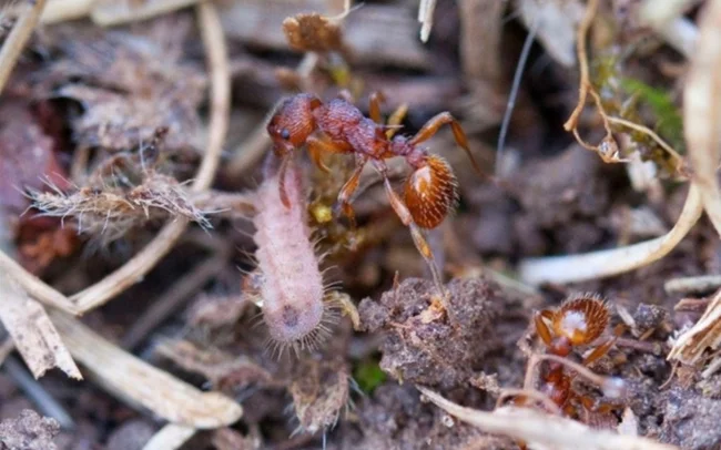 Для цього вони навчилися імітувати феромони та акустичні сигнали мурашиної королеви. Комахи приносять гусеницю до гнізда, де вона пожирає всіх личинок. Дослідження показали, що гусениця визначає, яка личинка стане наступною королевою і з'їдає її в першу чергу.